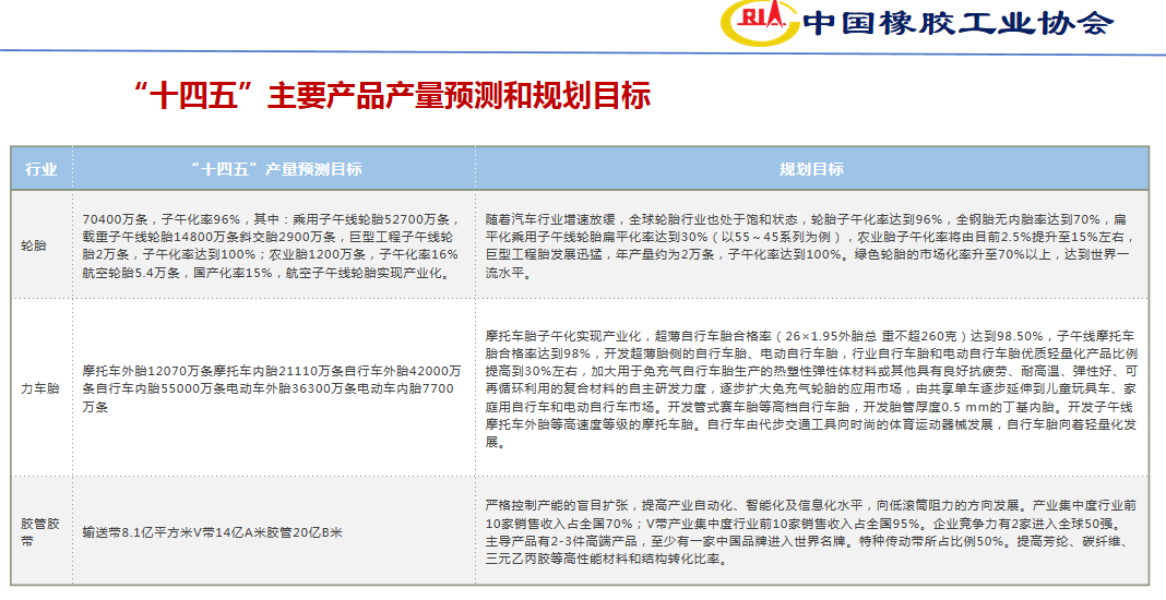 《规划》发展目标为,橡胶行业通过结构调整、科技创新、绿色发展,采取数字化、智能化、平台化和绿色化实现转型,推动质量变革、效率变革、动力变革,实现更高质量、更有效率、更加公平、更可持续、更为安全的发展。重点放在提高产品质量、自动化水平、信息化水平、生产效率、节能降耗、环境保护、产业集中度、企业竞争力和经济效益上,加快橡胶工业强国建设步伐。橡胶工业总量要保持平稳增长,但年均增长稍低于现有水平,继续稳固中国橡胶工业国际领先的规模影响力和出口份额。争取“十四五”末(2025年)进入橡胶工业强国中级阶段。